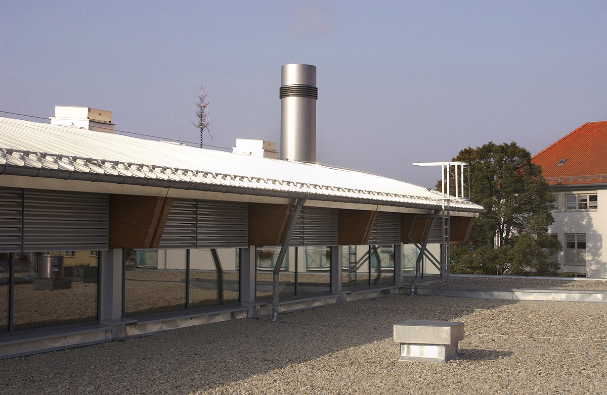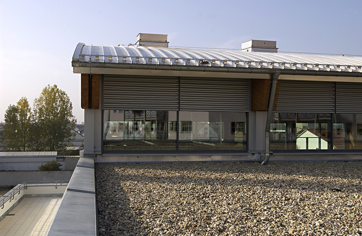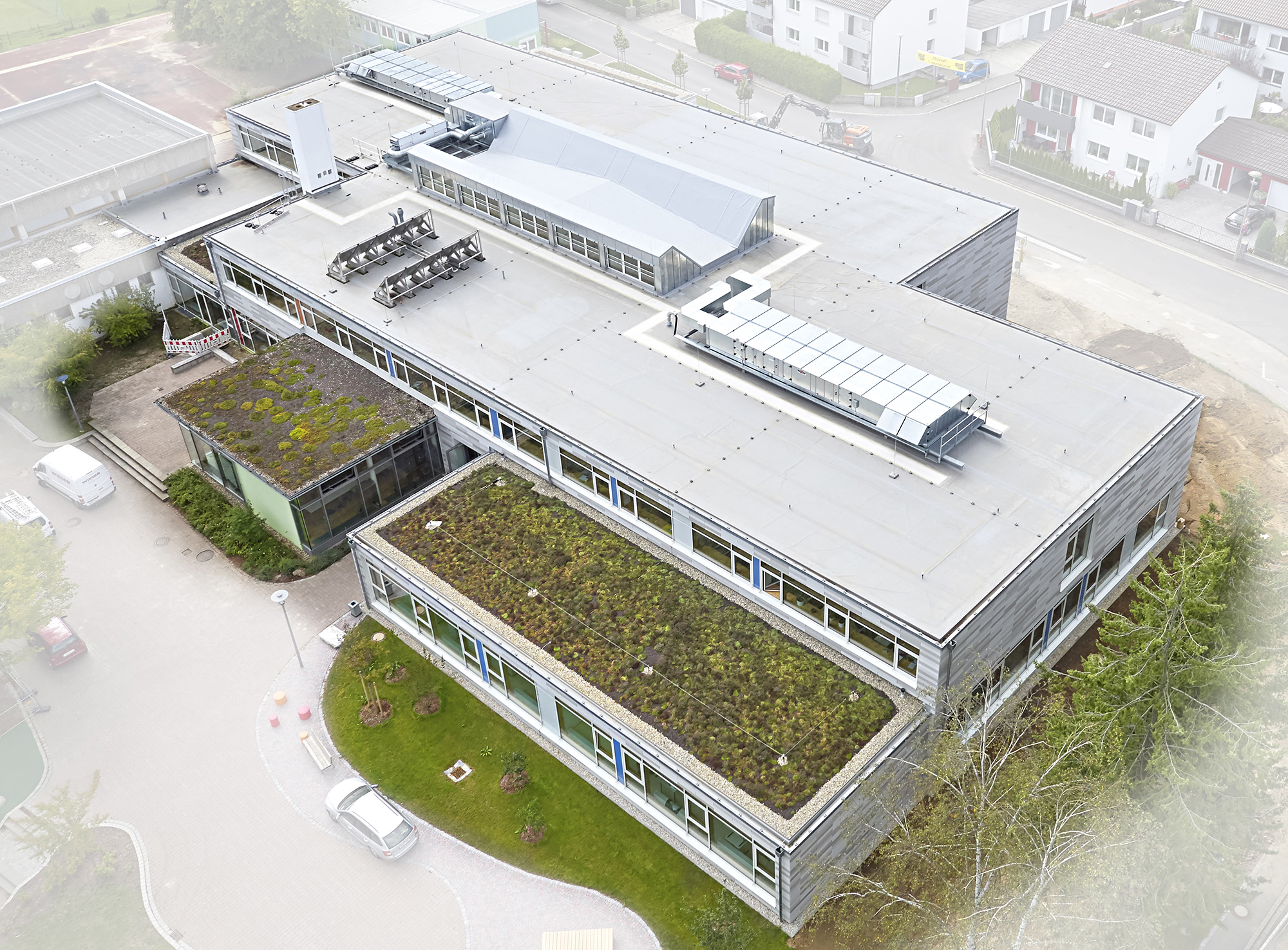 Bei der Flachdachsanierung des bestehenden angrenzenden Hallenbades erarbeitete Mario Schubert ebenfalls bereits gemeinsam mit dem Bauherrn ein Konzept aus und begleitete dies. Hier wurde die Kunststoffabdichtungsbahn Sarnafil TS 77-20 in der gleichen Farbe verwendet.