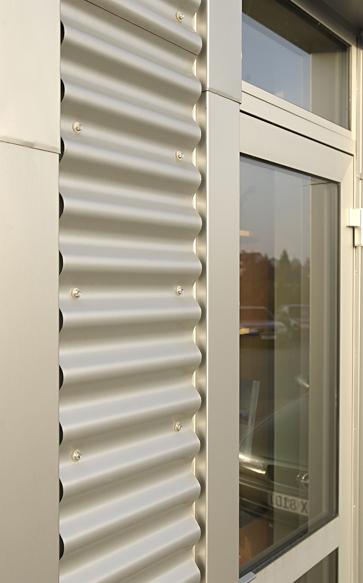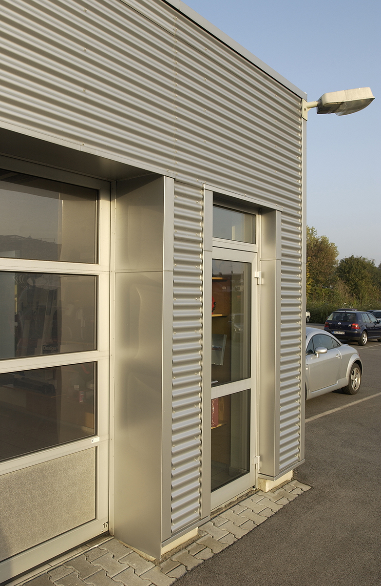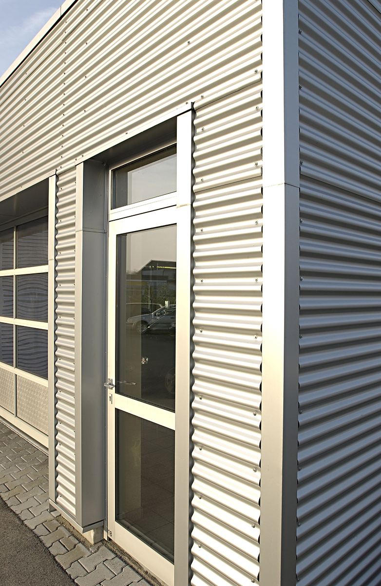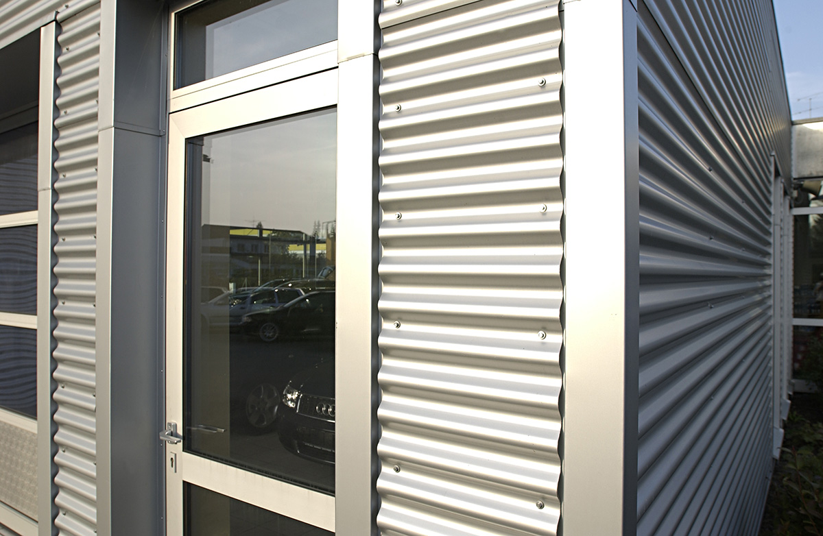 Individuelle Dachgestaltung und Fassadenverkleidung mit Trapezblech und Aluminiumprofilen.