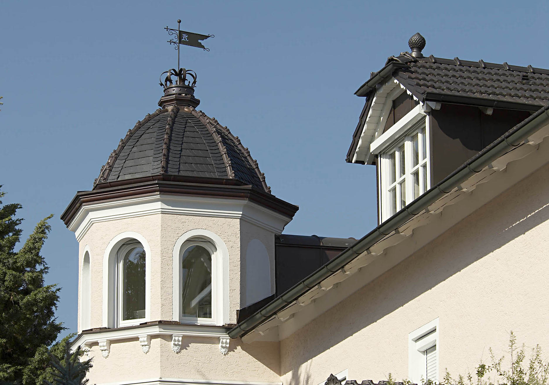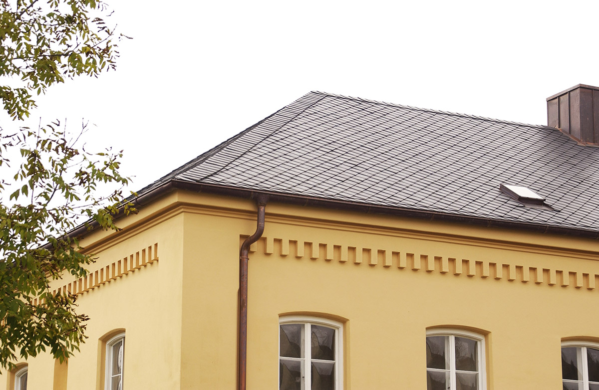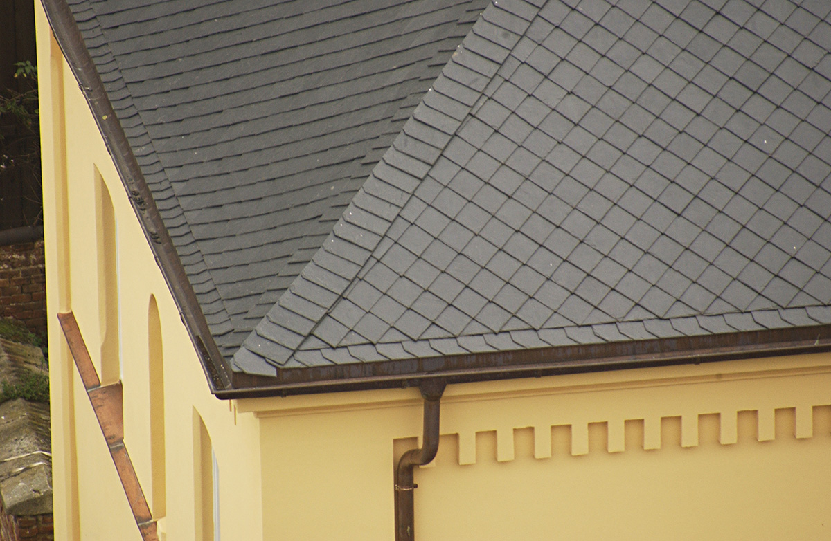 Biberschwanzziegeleindeckung schwarz engobiert, Spenglerarbeiten aus Kupfer